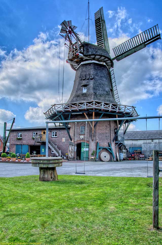 Zweistöckiger Galerieholländer (1895) mit Windrose und Jalousieflügeln, Bussel- Heck, vollständig restauriert. Horizontalgattersäge mit Wind und elektrischem Antrieb. Zwei Mahlgänge und ein Peldegang voll funktionsfähig.